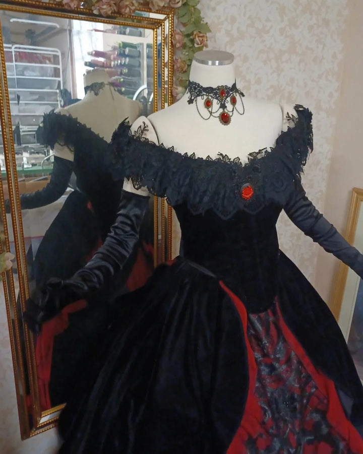 In a swift motion, MENDEL pulls DAHLIA into a twirl, as if dancing, sending her spinning toward the crowd. When it ceases, DAHLIA stands before her gala, changed. Her complexion is blue now, and her hair, raven black. A pair of bat-like wings adorn her back, and a crown of antlers like that of a deer wreath her head.